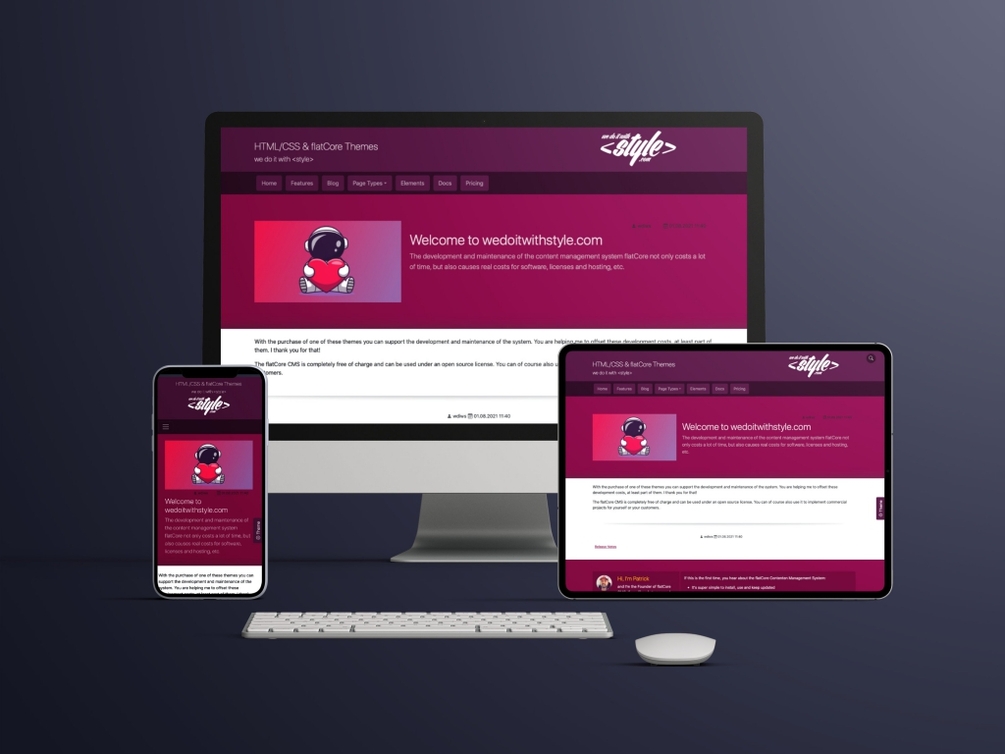 One theme with two color variants. Our flatCore themes are perfect for your customer projects, for club sites, for product or project presentations and much more. Use it with or without flatCore CMS.